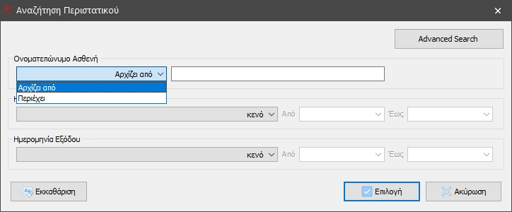 Επιλέγοντας Αναζήτηση Περιστατικού μπορεί ο χρήστης να αναζητήσει συγκεκριμένα περιστατικά από όλα τα περιστατικά. Η διαδικασία είναι σχετικά απλή και το μόνο που χρειάζεται να συμπληρώσουμε είναι το επώνυμο του ασθενή. Δίνεται η δυνατότητα να επιλέξουμε είτε να αρχίζει από τα γράμματα που θα πληκτρολογήσουμε είτε να περιέχει το ονοματεπώνυμο του ασθενή.