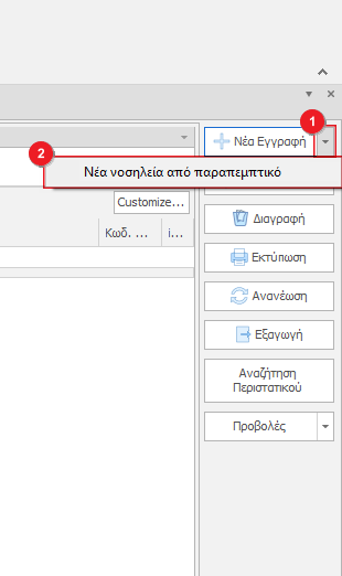 Για την καταχώρηση νέου περιστατικού κάνουμε κλικ στο κουμπί Νέα Εγγραφή. Εναλλακτικά για καταχώρηση περιστατικού μέσω παραπεμπτικού κάνουμε κλικ στο βελάκι(1) και επιλέγουμε Νέα νοσηλεία από παραπεμπτικό(2).