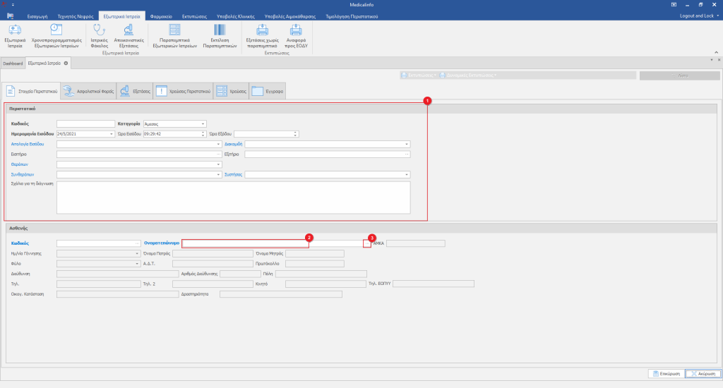 Συμπληρώνουμε τα στοιχεία του περιστατικού στην περιοχή Περιστατικο(1). Πληκτρολογούμε τα αρχικά γράμματα ή ολόκληρο το επώνυμο του ασθενή στο πεδίο Ονοματεπώνυμο(2). Πατάμε το πλήκτρο Enter ή κάνουμε κλικ στο κουμπί με το σύμβολο “…”(3)