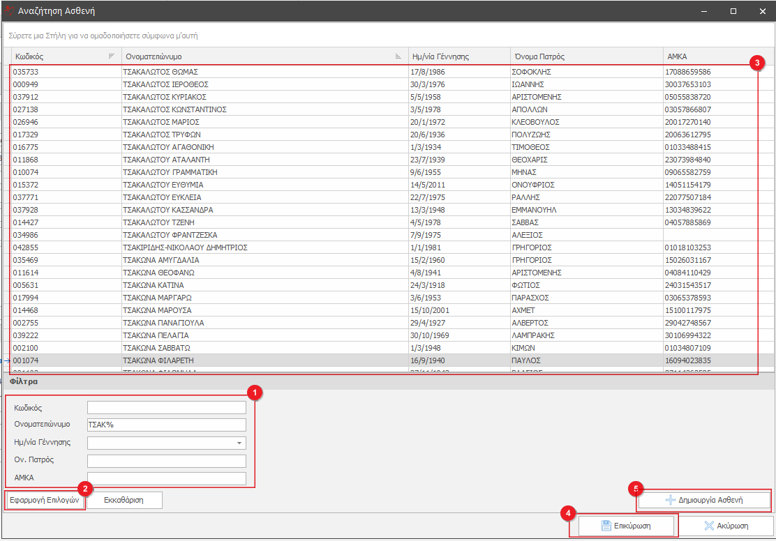 Στο αναδυόμενο παράθυρο εμφανίζονται όλοι οι καταχωρημένοι ασθενείς, με τα γράμματα του Ονοματεπώνυμου που ταιριάζουν στην αναζήτηση μας.