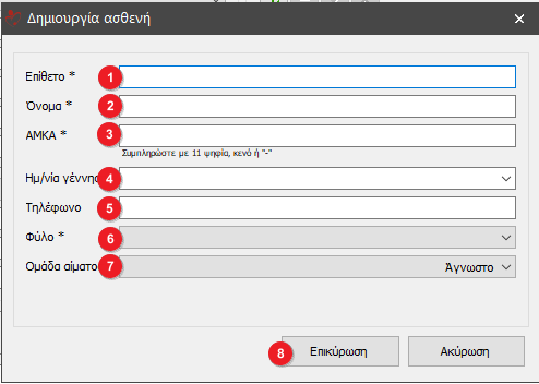 Για τη δημιουργία Νέου ασθενή συμπληρώνουμε τα παρακάτω πεδία: