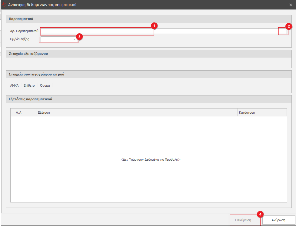 Στο παράθυρο αναζήτησης παραπεμπτικού πληκτρολογούμε τον αριθμό του παραπεμπτικού στο πεδίο(1) και κάνουμε κλικ στο κουμπί με το σύμβολο “…”(2). Ενημερώνονται όλα τα στοιχεία του παραπεμτικού και αν επιθυμούμε συμπληρώνουμε την Ημερομηνία Λήξης(3) του παραπεμπτικού. Τέλος κάνουμε κλικ το κουμπί Επικύρωση(4).