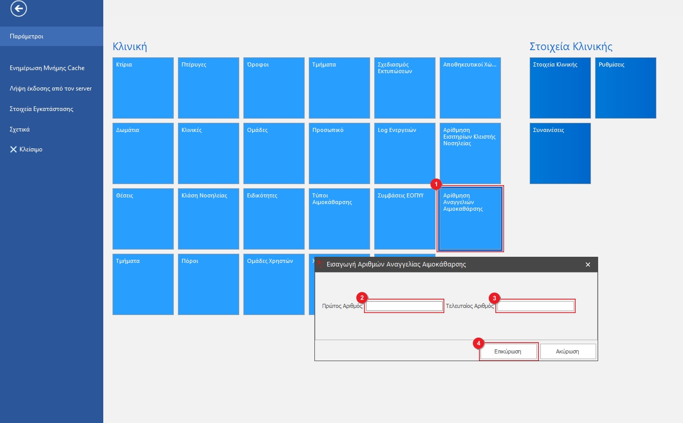Από το μενού ρυθμίσεων επιλέγουμε Αρίθμηση Αναγγελιών Αιμοκάθαρσης(1). Στο αναδυόμενο παράθυρο συμπληρώνουμε τον Πρώτο Αριθμό(2)  και τον Τελευταίο Αριθμό(3) από τους δεσμευμένους αριθμούς Αναγγελίας Αιμοκάθαρσης. Τέλος κάνουμε Επικύρωση(4)