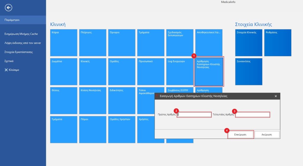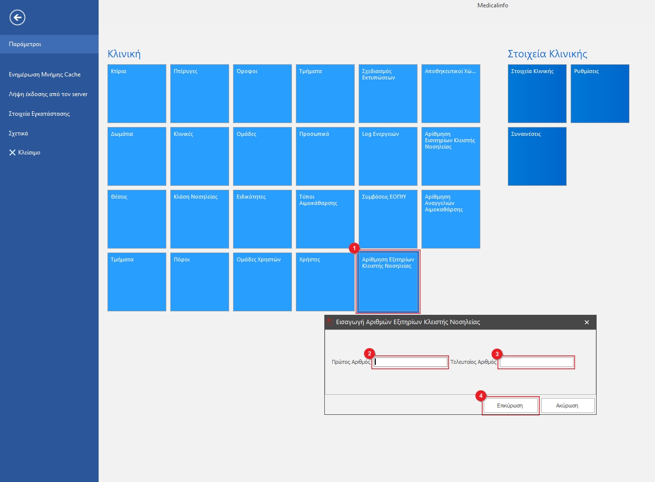 Από το μενού ρυθμίσεων επιλέγουμε Αρίθμηση Εξιτηρίων Κλειστής Νοσηλείας(1).