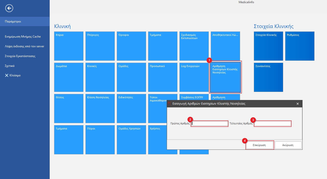 Από το μενού ρυθμίσεων επιλέγουμε Αρίθμηση Εισιτηρίων Κλειστής Νοσηλείας(1).