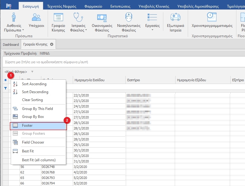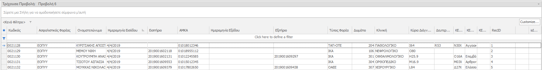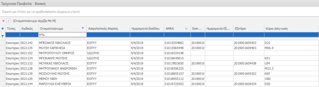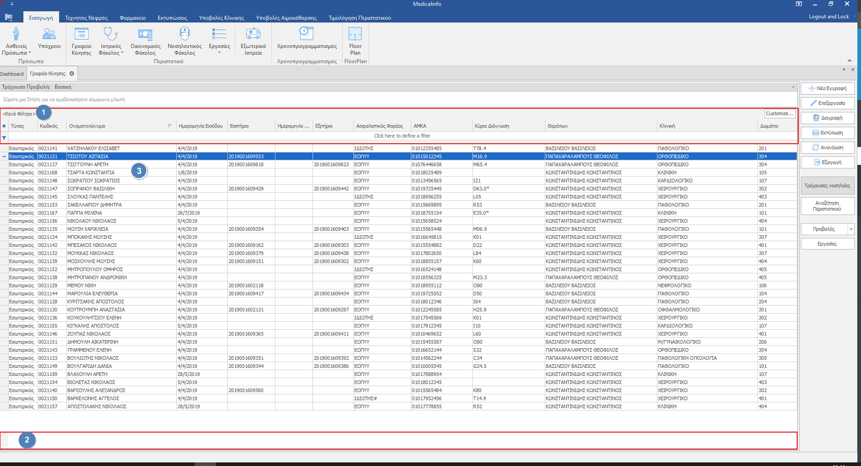Από τα πρώτα πλέγματα/λίστες που έρχεται σε επαφή ο χρήστης είναι το γραφείο κίνησης και ο ιατρικός φάκελος.