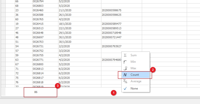 Κάνοντας το προηγούμενο βήμα εμφανίζεται στο κάτω μέρος της λίστας μία περιοχή στην οποία κάνοντας δεξί κλικ (1)εμφανίζεται το μενού λειτουργιών του υποσέλιδου. Επιλέγοντας το Count(2) εμφανίζεται το πλήθος των εγγραφών της λίστας(3).