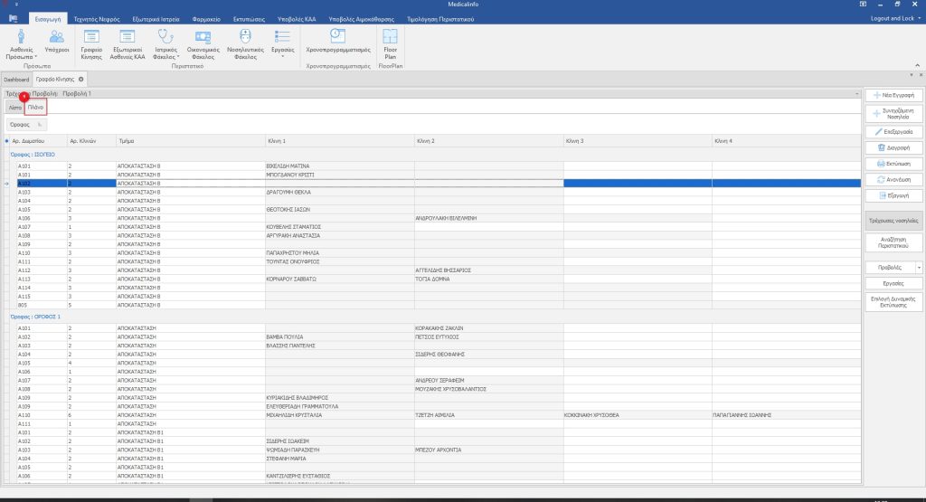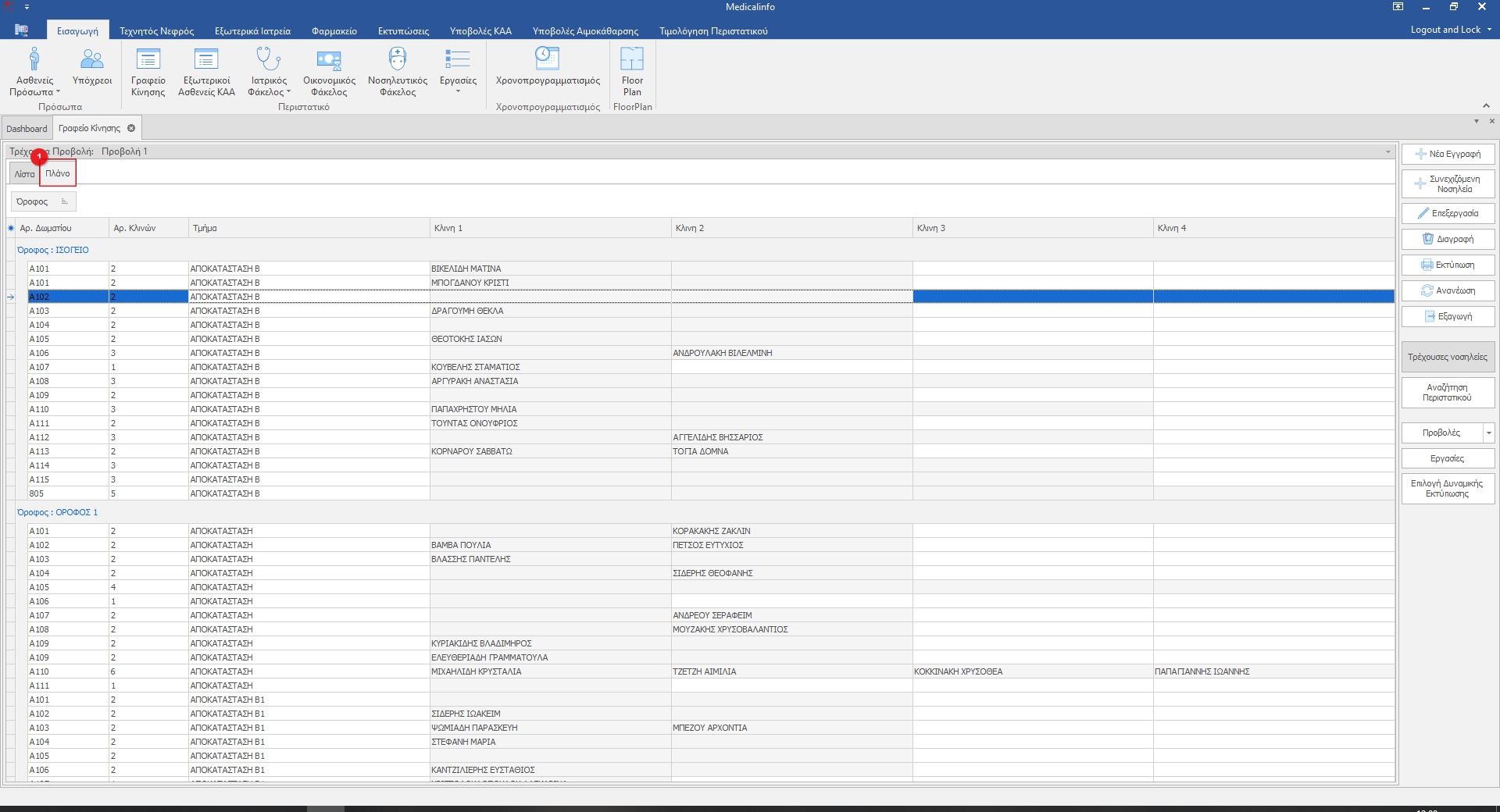 Κάνουμε κλικ στην καρτέλα Πλάνο(1) και η προβολή αλλάζει. Από λίστα περιστατικών σε πλάνο δωματίων. Κάνουμε διπλό κλικ στο ονοματεπώνυμο του ασθενή για είσοδο στο περιστατικό. Με τη λειτουργία Πλάνο γίνεται διαχείριση μόνο των ενεργών περιστατικών.