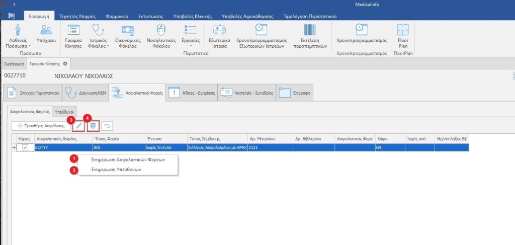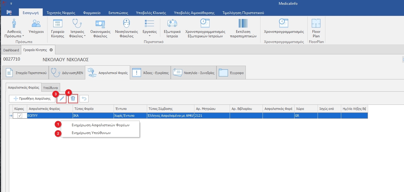 Για επεξεργασία του ασφαλιστικού φορέα κάνουμε κλικ το κουμπί Επεξεργασία Φορέα(3) και για διαγραφή το κουμπί Διαγραφή Φορέα(4).