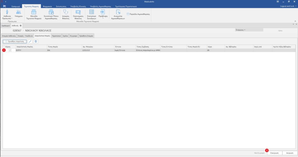 Έχουμε δημιουργήσει τα στοιχεία του Ασφαλιστικού Φορέα του Ασθενή- Περιστατικού(1) κάνουμε κλικ στο κουμπί Επικύρωση(2) για να αποθηκευτεί η καταχώρησή μας.