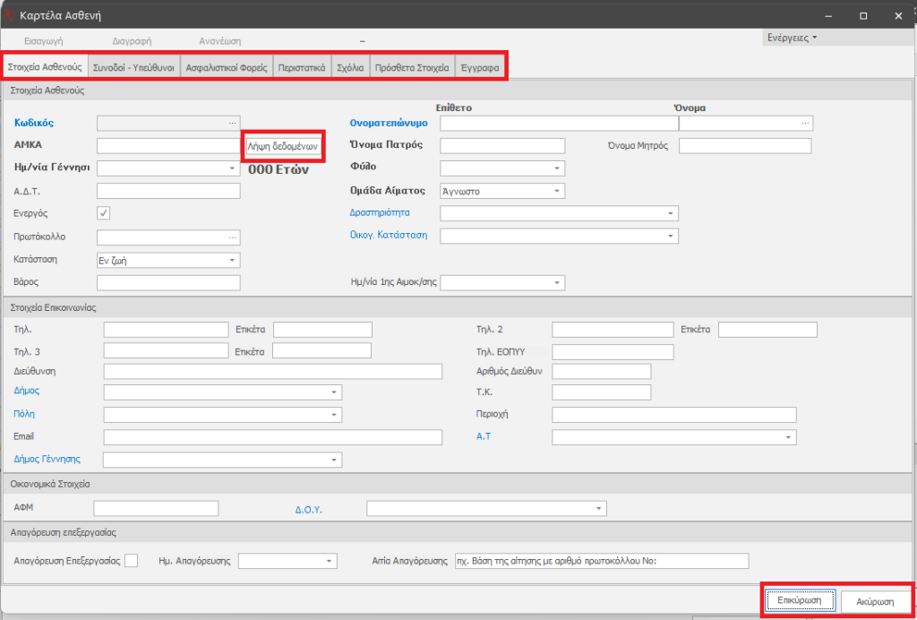 Η εισαγωγή ενός ασθενή (δημογραφικά στοιχεία) μπορεί να γίνει από δύο διαφορετικές καρτέλες: