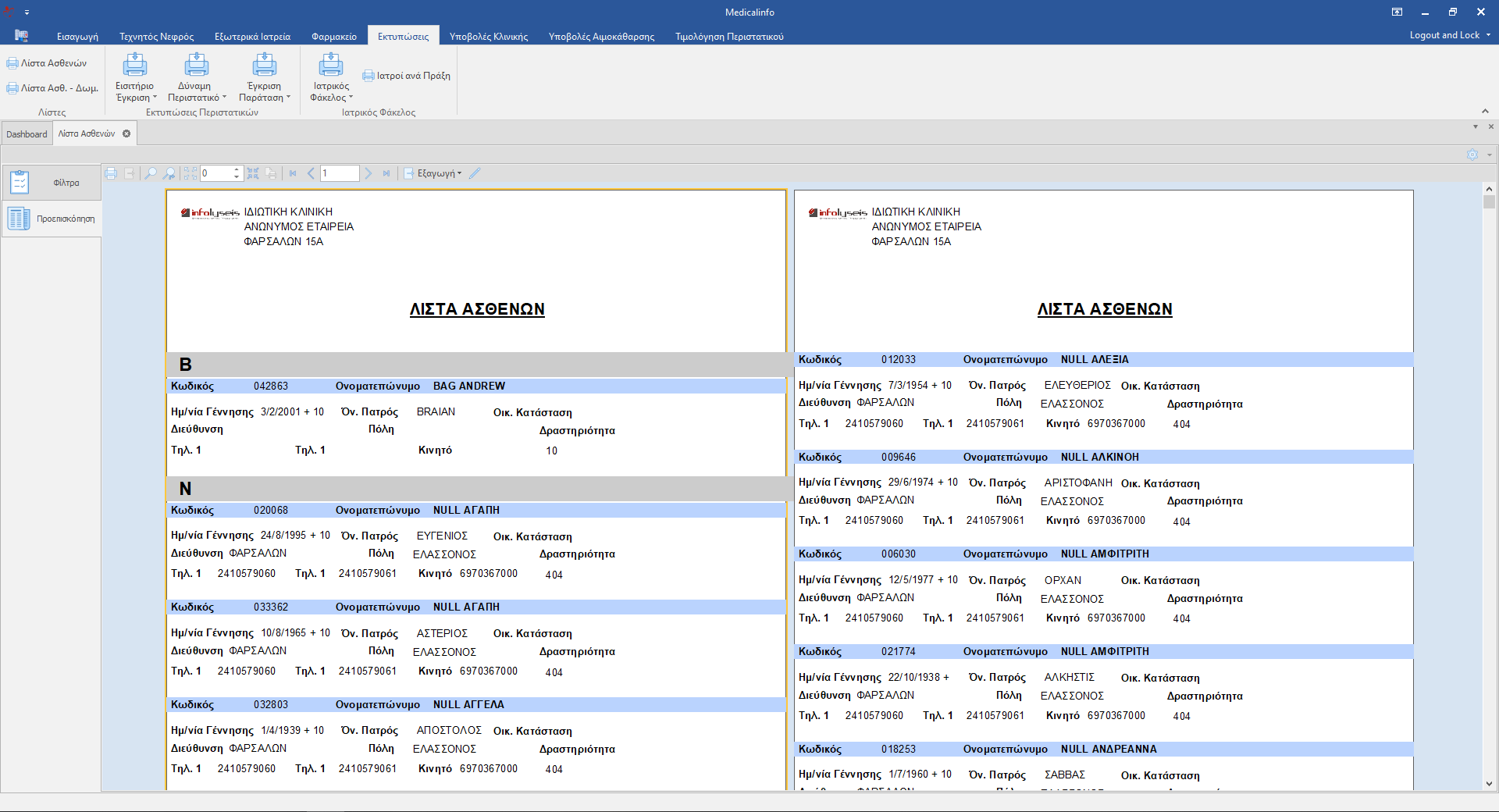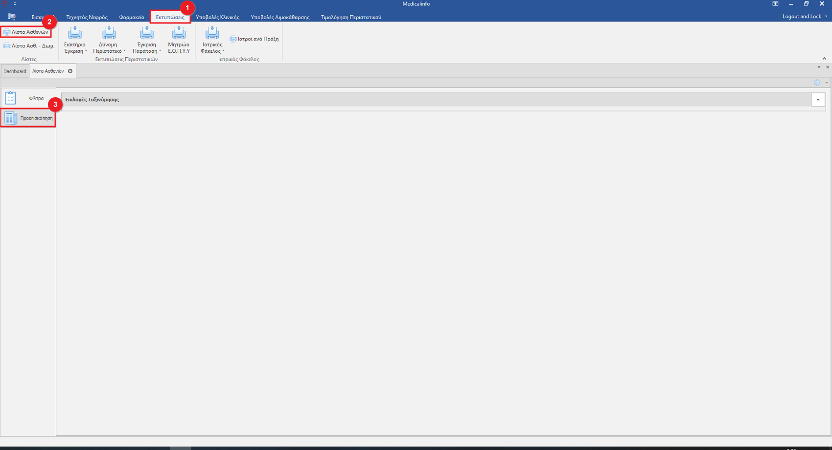 Estimated reading: 0 minutes 13 views Λίστα Ασθενών Για να εμφανίσουμε την Λίστα Ασθενών από το Μενού Εκτυπώσεις(1) επιλέγουμε Λίστα ασθενών(2). Στα αριστερά του κυρίως παραθύρου κάνουμε κλικ στην καρτέλα Προεπισκόπηση(3). Εικόνα 1 Εικόνα 2