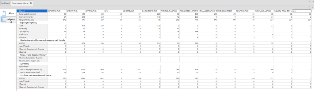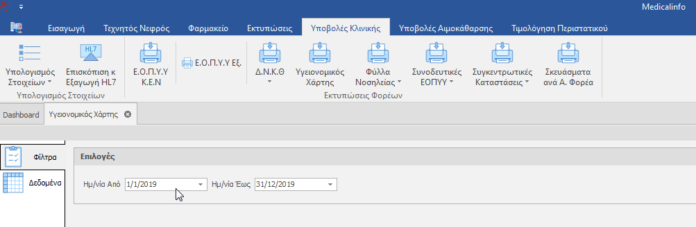 Estimated reading: 0 minutes 9 views Υγειονομικός Χάρτης Ο Υγειονομικός Χάρτης απεικονίζει τη ροή της κλινικής βάση ασθενών . Βρίσκεται στις Υποβολές Κλινικής. Στη καρτέλα Φίλτρα προσθέτουμε την ημερομηνία που θέλουμε και επιλέγουμε τη καρτέλα Δεδομένα.