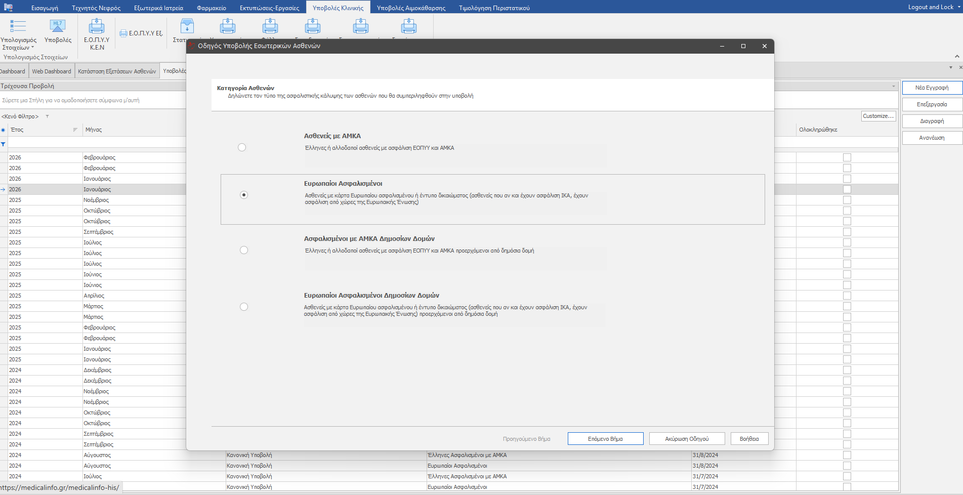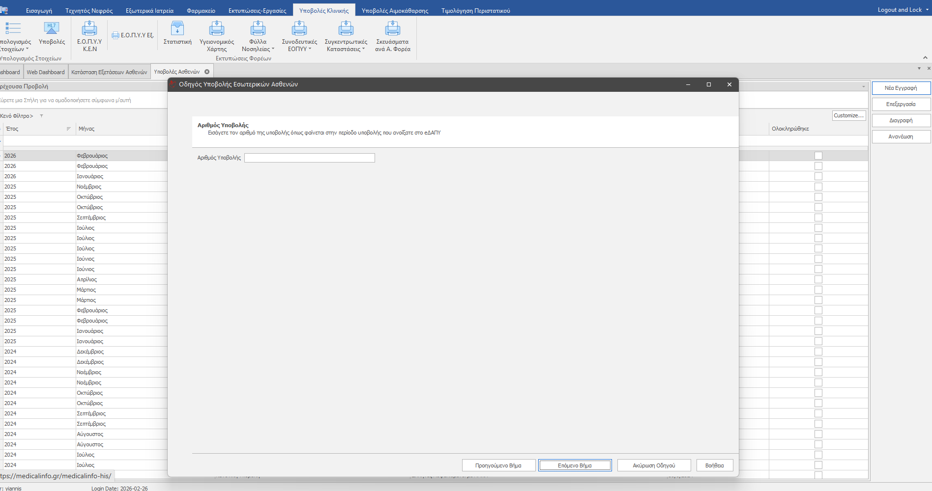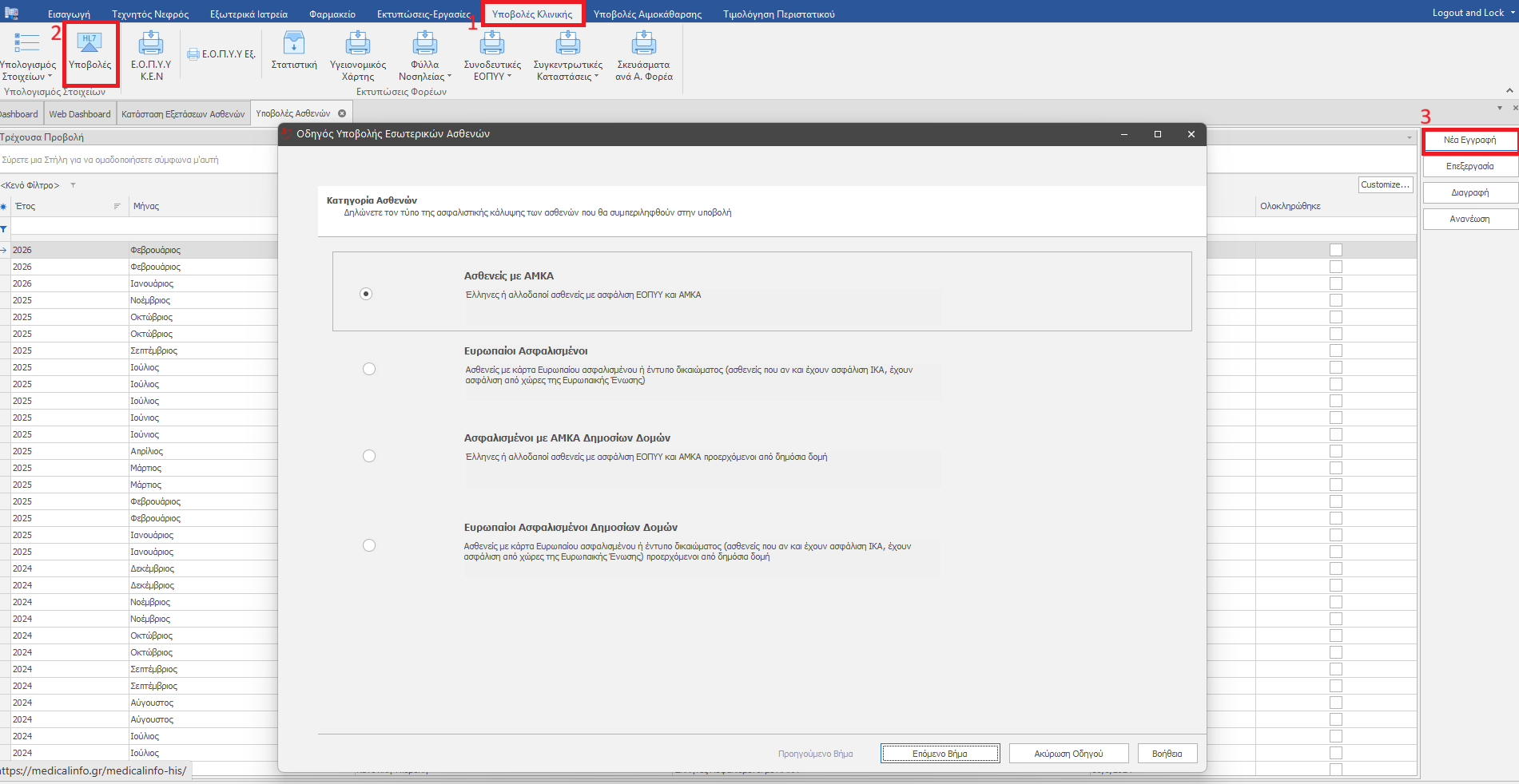 Επιλέγουμε Υποβολές Κλινικής (1) , μετά Υποβολές HL7 (2) και Νέα εγγραφή (3) για να δημιουργήσουμε νέα υποβολή. Εμφανίζεται η δίπλα εικόνα.