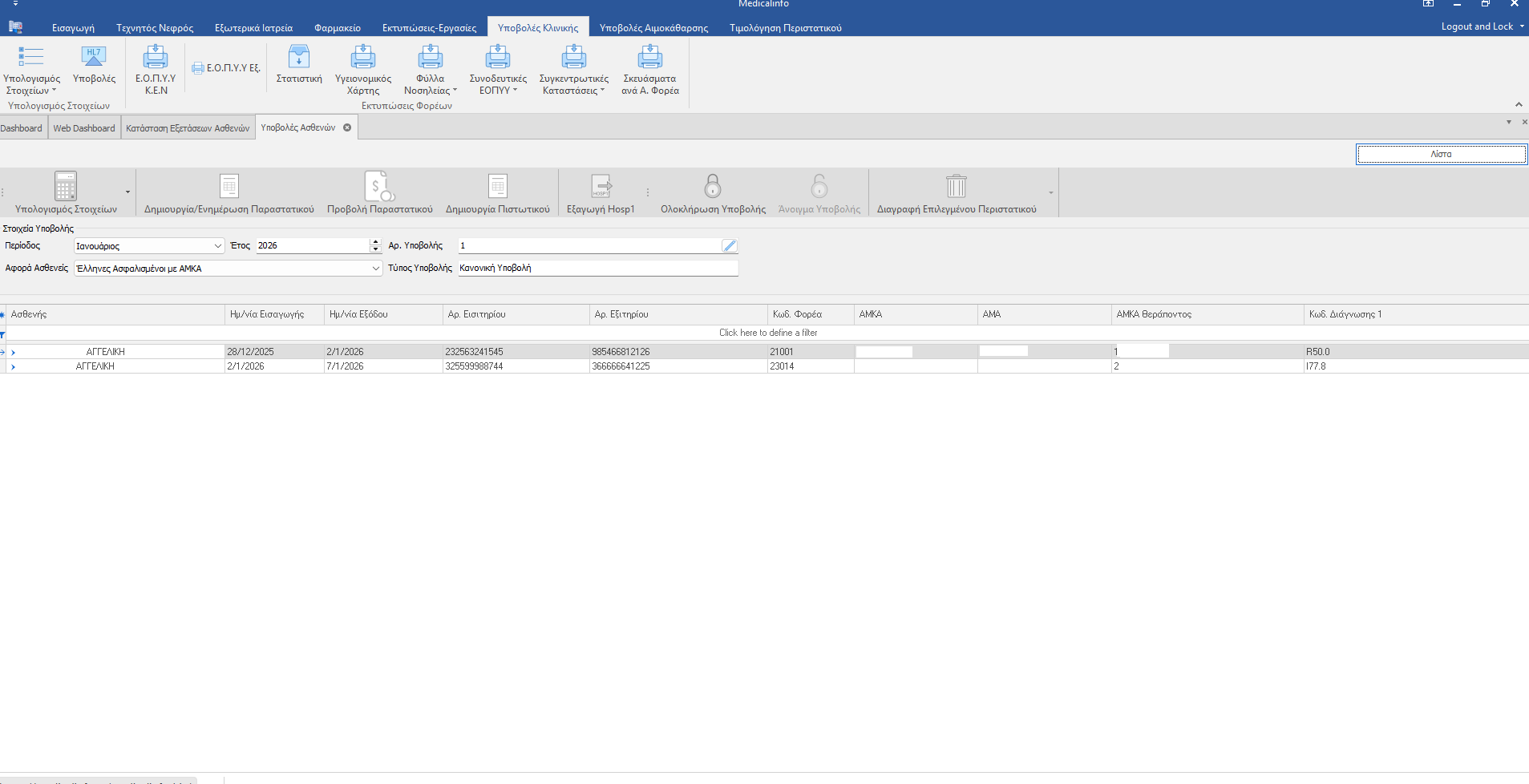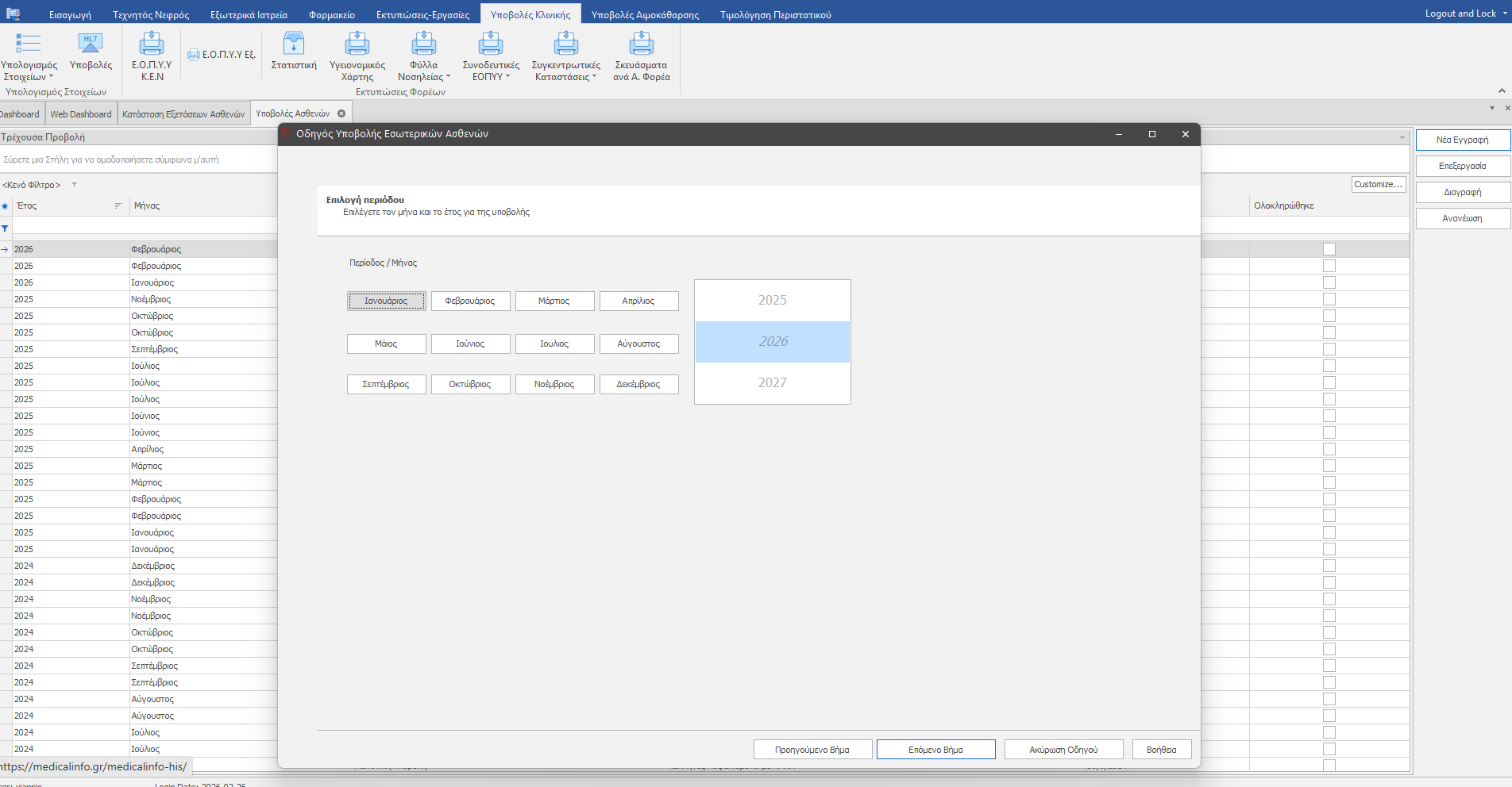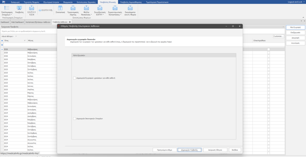 Επιλέγουμε Υποβολές Κλινικής (1) , μετά Υποβολές HL7 (2) και Νέα εγγραφή (3) για να δημιουργήσουμε νέα υποβολή. Εμφανίζεται η δίπλα εικόνα.