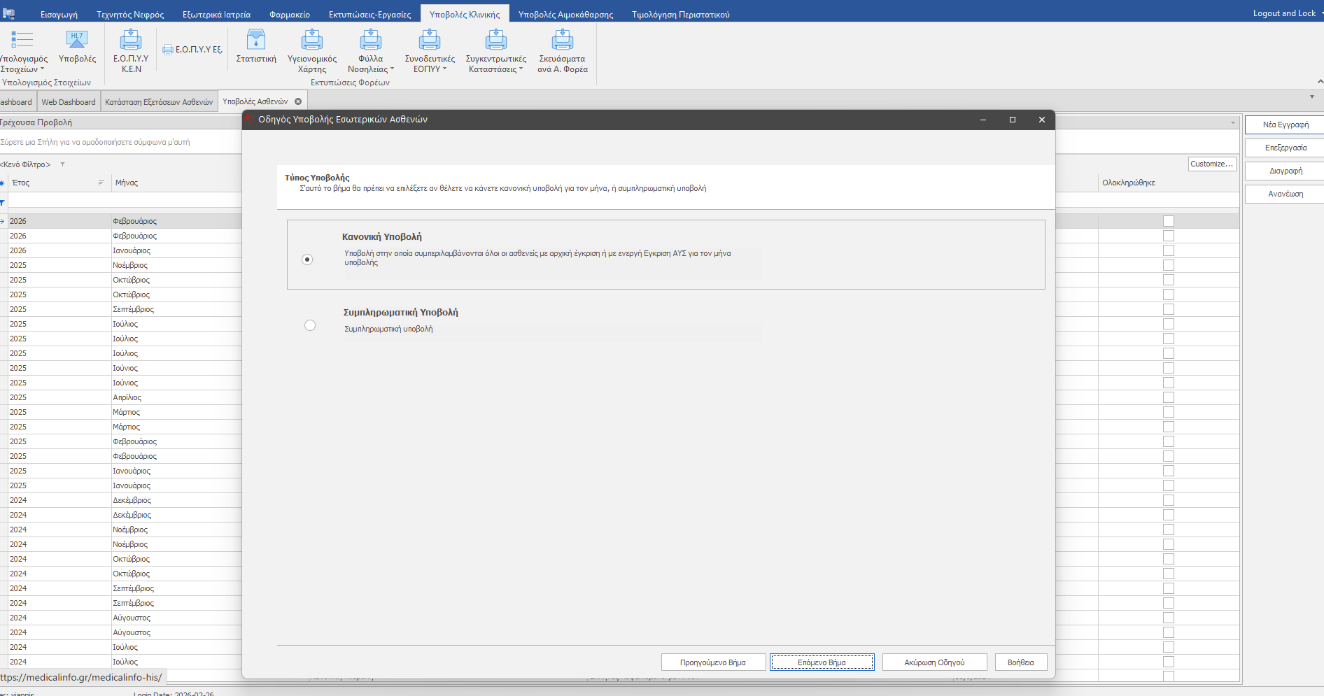 Σε αυτό το βήμα ,επιλέγουμε αν πρόκειται για κανονική ή συμπληρωματική υποβολή και αφού επιλέξουμε πατάμε Επόμενο Βήμα.
