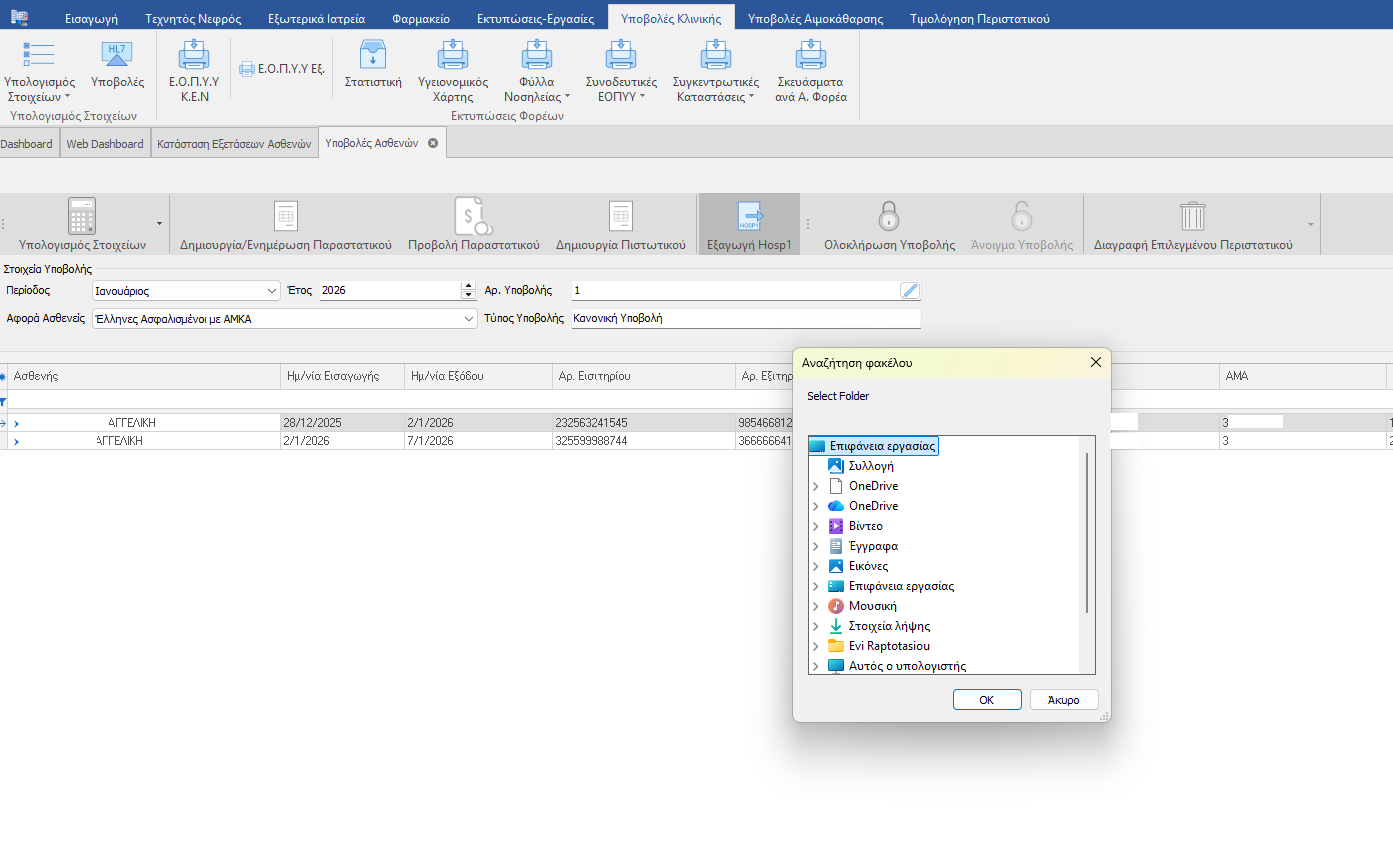 Κάνουμε κλίκ στο Εξαγωγή Hosp1, εμφανίζεται ένα παράθυρο διαλόγου όπου μας ζητά το σημείο που θα γίνει η αποθήκευση του αρχείου. Για λόγους ευκολίας και αποφυγής λαθών συνιστούμε η αποθήκευση να γίνεται πάντα στην Επιφάνεια εργασίας.