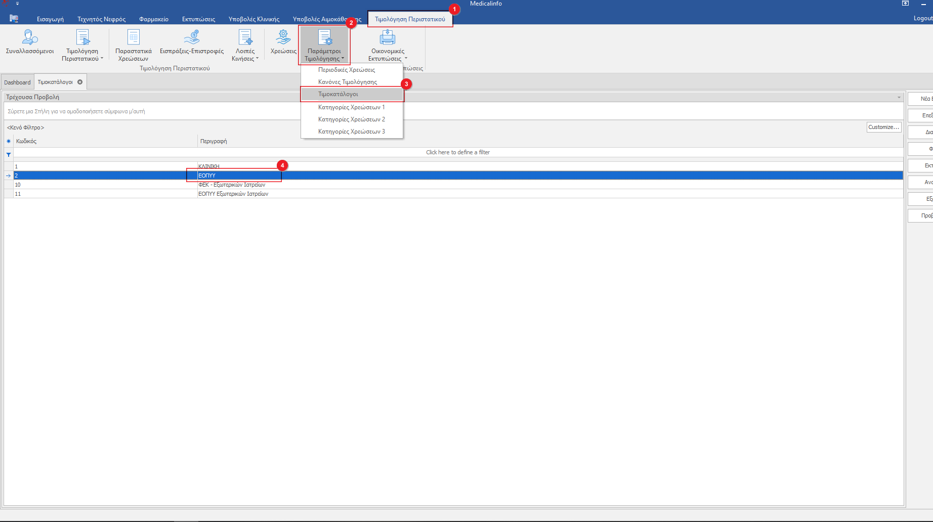 Κάνουμε κλικ από το Μενού Τιμολόγηση Περιστατικού(1) στο υπομενού Παράμετροι Τιμολόγησης(2) και από τη λίστα επιλέγουμε Τιμοκατάλογοι(3). Από τη λίστα που μας εμφανίζεται επιλέγουμε την εγγραφή του ΕΟΠΥΥ(4) και είτε κάνουμε διπλό κλικ στην εγγραφή είτε αφού επιλέξουμε την εγγραφή πατάμε το κουμπί “επεξεργασία” που βρίσκεται στην δεξιά στήλη.