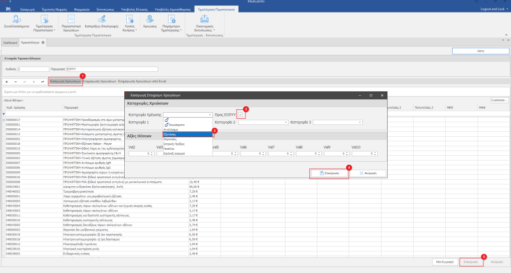 Επιλέγουμε το κουμπί Εισαγωγή Χρεώσεων(1) στο παράθυρο που μας άνοιξε επιλέγουμε από την κατηγορία Χρεώσεις τις Εξετάσεις(2) στη συνέχεια τσεκάρουμε το checkbox που αναγράφει Προς ΕΟΠΥΥ(3) και πατάμε Επικύρωση(4). Όταν ολοκληρωθεί η διαδικασία εισαγωγής κάνουμε κλικ στο κουμπί Επικύρωση(5).