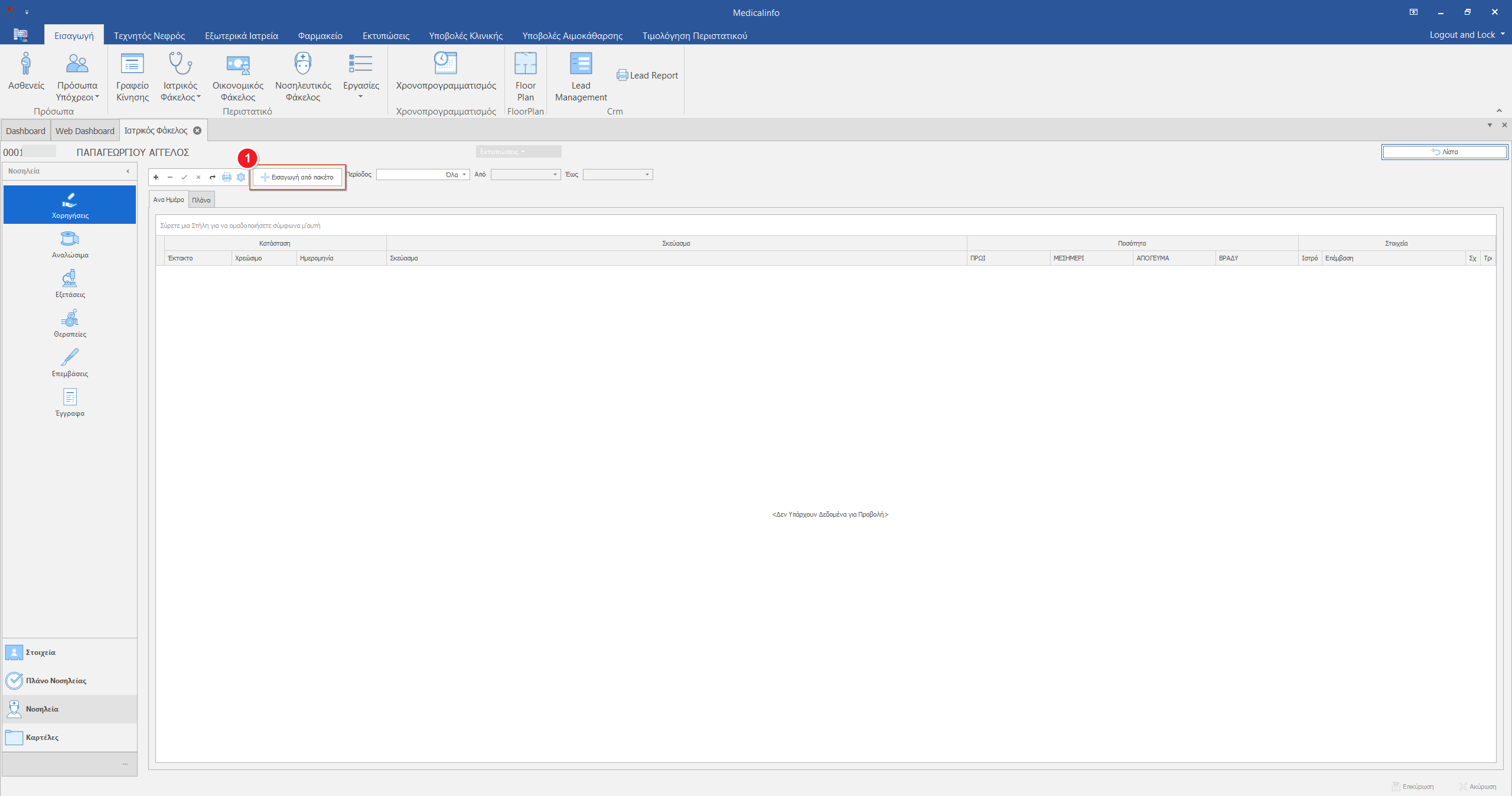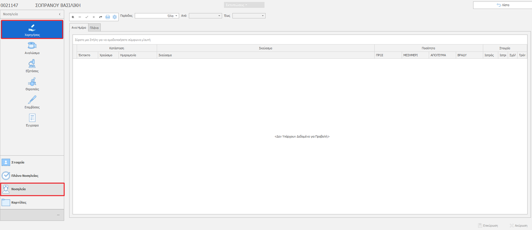 Κάνουμε κλικ στην καρτέλα Νοσηλεία και στη συνέχεια στην καρτέλα Χορηγήσεις.