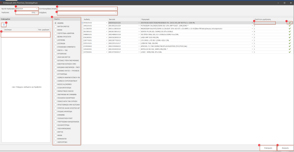Στο αναδυόμενο παράθυρο επιλέγουμε Ημερομηνία(1), αν έχει καταχωρηθεί επέμβαση την επιλέγουμε το πεδίο Επέμβαση(2) και η ημερομηνία συμπληρώνεται αυτόματα με βάσει την ημερομηνία της επέμβασης. Επιλέγουμε τον Συνταγογράφο Ιατρό(3) και πότε έγινε η χορήγηση(4). Στη συνέχεια επιλέγουμε από ποιο πακέτο(5) θα εμφανιστούν τα σκευάσματα. Αν θέλουμε να αλλάξουμε την προεπιλεγμένη ποσότητα κάνουμε την αλλαγή στο πεδίο Ποσότητα(6) και για εισαγωγή κάνουμε κλικ στο κουμπί με το σύμβολο “V”(7). Η επιλογή μας μπαίνει στην αριστερή στήλη(8), αν ήταν λάθος ή θέλουμε να τη διαγράψουμε κάνουμε κλικ στο κουμπί με τον κάδο(9). Για να αποθηκευτεί η εγγραφή κάνουμε κλικ στο κουμπί Επικύρωση(10) διαφορετικά αν θέλουμε να αναιρέσουμε την ενέργεια κάνουμε κλικ στο κουμπί Ακύρωση(11).