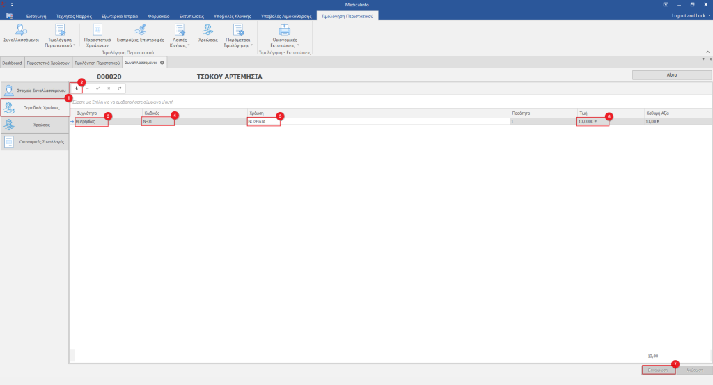 Κάνουμε κλικ στην καρτέλα Περιοδικές Χρεώσεις(1). Για να προσθέσουμε μία περιοδική Χρέωση πατάμε το σύμβολο “+”(2). Στη νέα γραμμή χρέωσης επιλέγουμε την συχνότητα(3) της χρέωσης. Κάνουμε αναζήτηση χρέωσης με Κωδικό(4) ή περιγραφή Χρέωσης(5) στα αντίστοιχα πεδία. Ελέγχουμε ή συμπληρώνουμε την Τιμή(6) της χρέωσης. Τέλος Επικυρώνουμε(7). Για χρεώσεις ανά ημέρα στο πεδίο συχνότητα(3) επιλέγουμε Ημερησίως, για χρεώσεις ανά Μήνα επιλέγουμε Μηνιαίως κ.ο.κ.