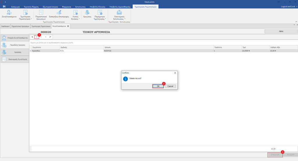 Αν επιθυμούμε να διαγράψουμε μία εγγραφή, την επιλέγουμε και κάνουμε κλικ στο κουμπί με το σύμβολο“-“(1). Στη συνέχεια κάνουμε κλικ ΟΚ(2) στο προειδοποιητικό μήνυμα και τέλος Επικυρώνουμε(3).  Για αλλαγές-διορθώσεις σε υπάρχουσες χρεώσεις, πραγματοποιούμε τις αλλαγές-διορθώσεις και Επικυρώνουμε.