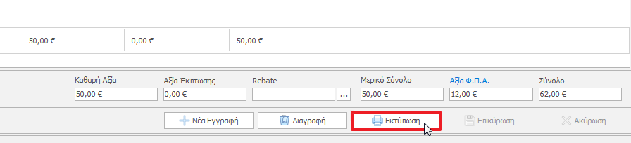 Για να επανεκτυπώσουμε το παραστατικό, θα πρέπει να πατήσουμε το κουμπί Εκτύπωση.