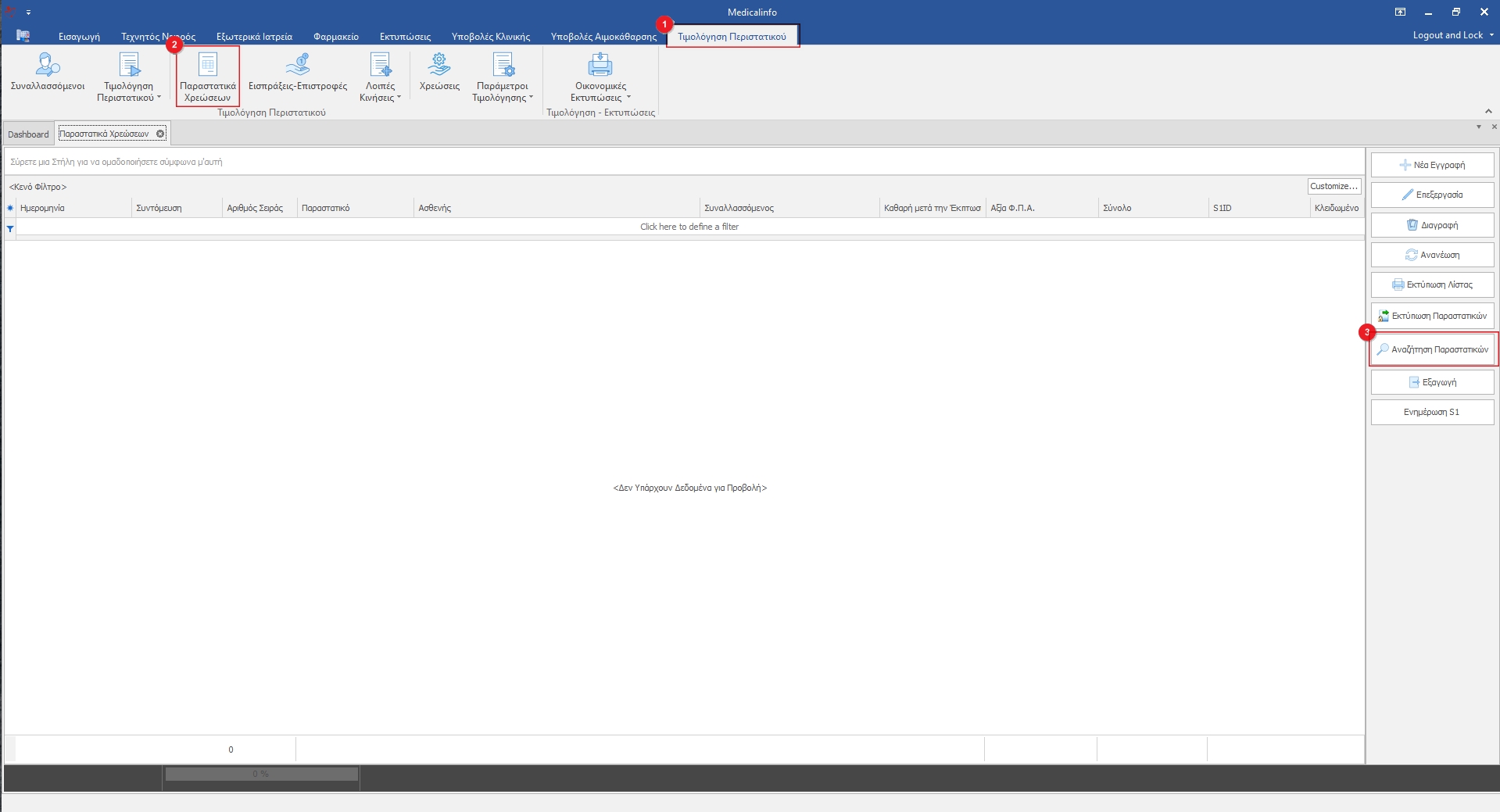 Αρχικά θα εμφανιστούν τα παραστατικά με ημερομηνία έκδοσης την τρέχουσα, για να αναζητήσουμε ένα ή και περισσότερα παραστατικά χρέωσης κάνουμε κλικ στο κουμπί Αναζήτηση Παραστατικού(3).