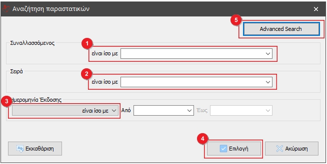 Όταν ολοκληρώσουμε με την καταχώρηση των κριτηρίων αναζήτησης κάνουμε κλικ στο κουμπί Επιλογή(4).