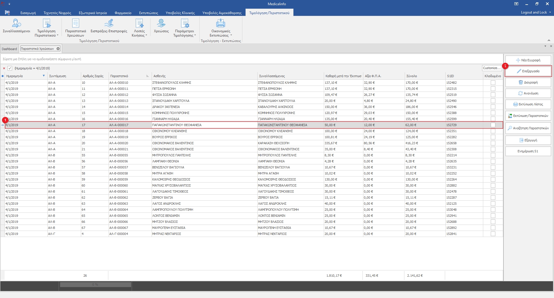 Για να ανοίξουμε το παραστατικό(1), το επιλέγουμε από τη λίστα και κάνουμε διπλό κλικ ή κάνουμε κλικ στο κουμπί Επεξεργασία(2).