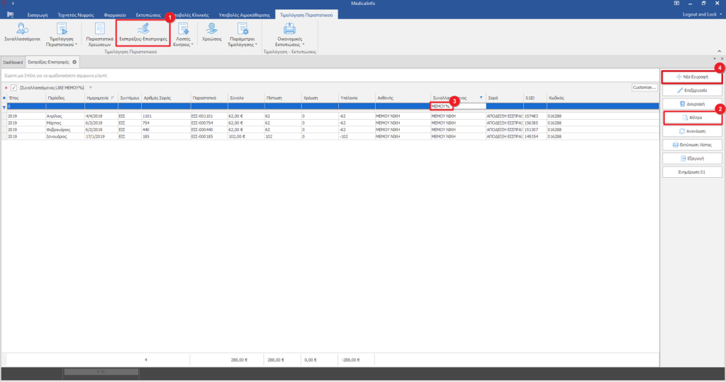 3. Στη γραμμή αναζήτησης βρίσκουμε τον συναλλασσόμενο που επιθυμούμε και κάνουμε διπλό κλικ στην εγγραφή(παραστατικό) που θέλουμε να δούμε, εναλλακτικά επιλέγουμε την εγγραφή και από το αριστερό μενού κάνουμε κλικ στο Επεξεργασία(4).
