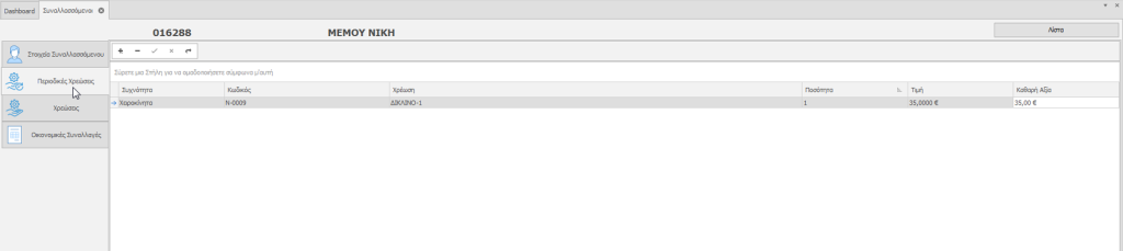 Στην καρτέλα Χρεώσεις ο χρήστης  μπορεί να δει τις χρεώσεις του συναλλασσόμενου αναλυτικά και συγκεντρωτικά.