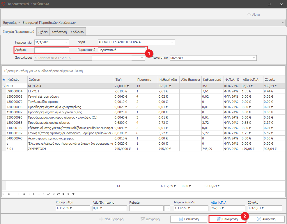 Εφόσον οριστικοποιηθούν από το χρήστη οι χρεώσεις του παραστατικού κάνουμε κλικ στην Επικύρωση(2).