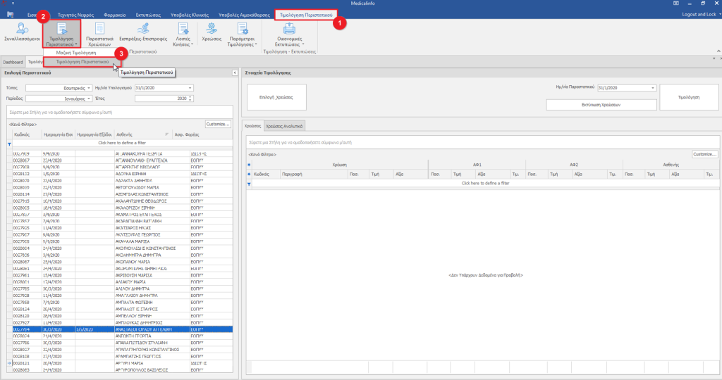 Κάνουμε κλικ στο μενού Τιμολόγηση Περιστατικού(1), από την Τιμολόγηση Περιστατικού(2) επιλέγουμε Τιμολόγηση Περιστατικού(3).