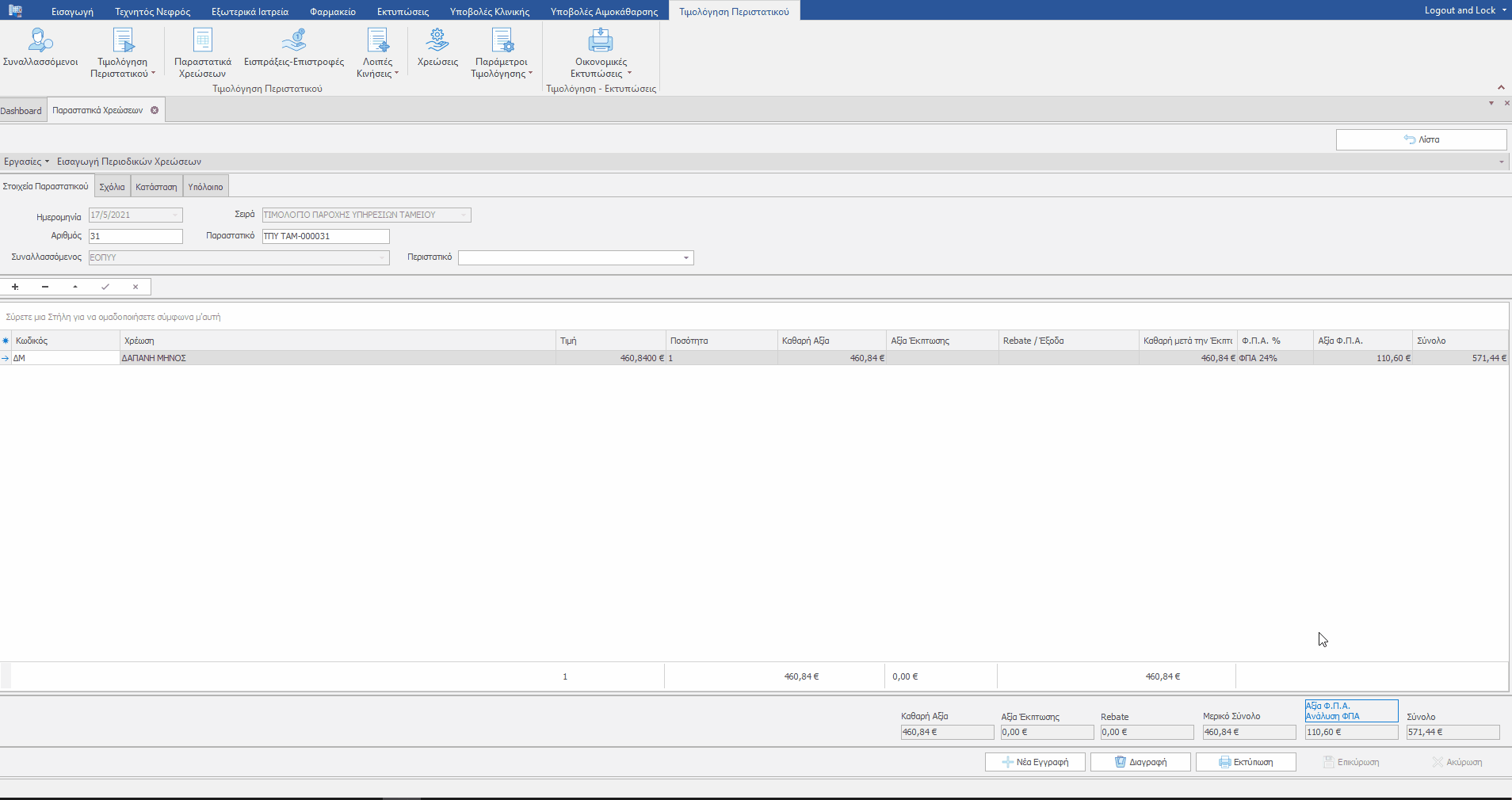 Παραστατικά χρέωσης προς ΕΟΠΥΥ (προ αναβάθμισης) με πάνω από μία γραμμή χρέωσης είναι απαραίτητο να τα επεξεργαστούμε ώστε να είναι επιτυχής η διαβίβαση προς το MyData, θα πρέπει να αντικαταστήσουμε τις γραμμές χρέωσης με μία γραμμή χρέωσης ( ΔΜ-ΔΑΠΑΝΗ ΜΗΝΟΣ).