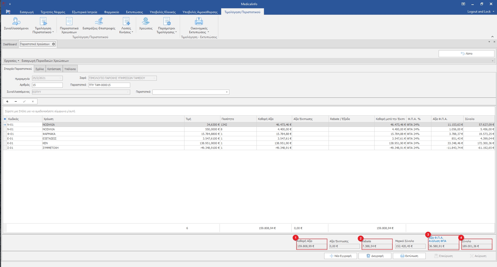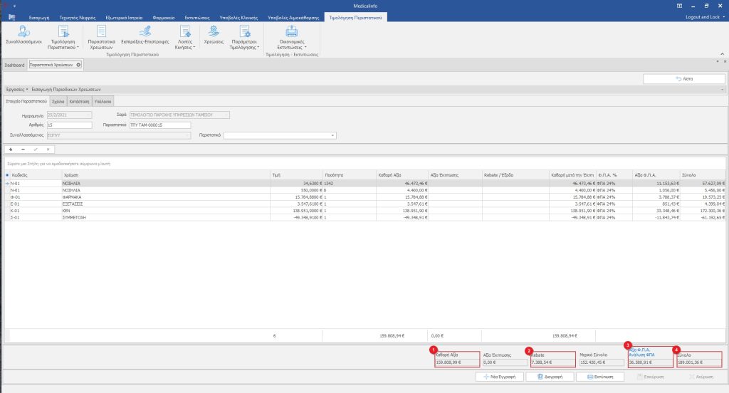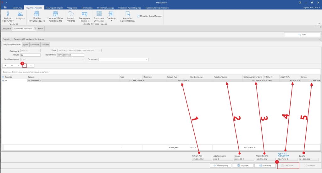Αρχικά σημειώνουμε τα ποσά Καθαρή Αξία(1)Rebate(2)Μερικό Σύνολο(3)Αξία Φ.Π.Α(4) και Σύνολο(5). Ώστε να συμπληρώσουμε τα ποσά στα αντίστοιχα πεδία της νέας γραμμής χρέωσης.
