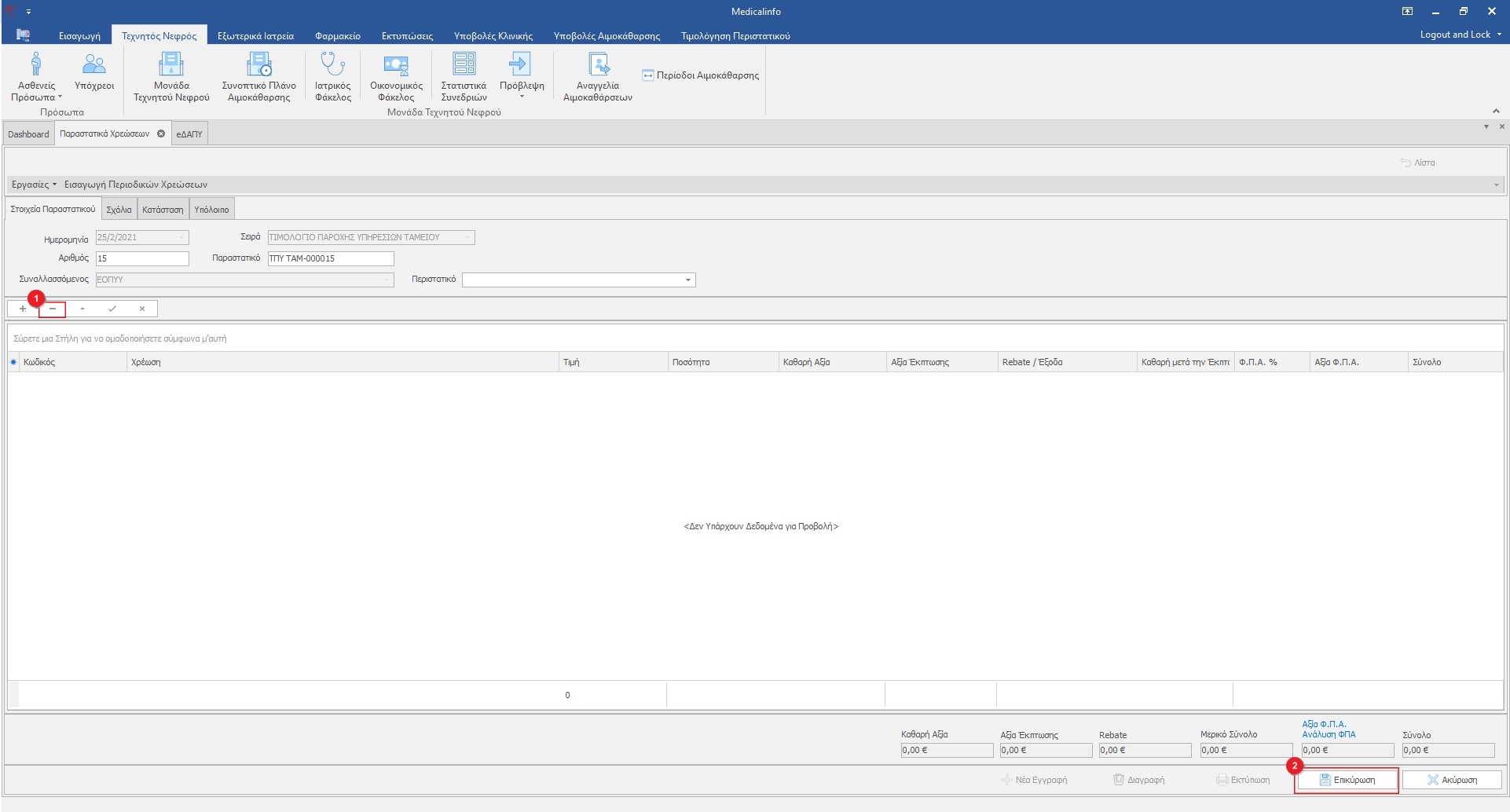 Στη συνέχεια Διαγράφουμε όλες τις γραμμές χρέωσης επιλέγοντας κάθε γραμμή και πατώντας το κουμπί “-“(1), όταν σβήσουμε και την τελευταία χρέωση κάνουμε κλικ στο κουμπί Επικύρωση(2).