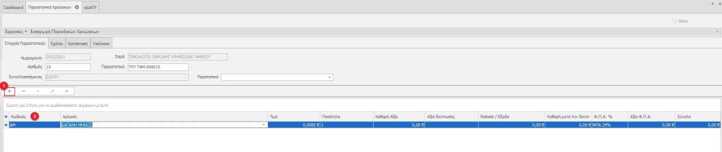 Για να εισάγουμε την νέα γραμμή χρέωσης κάνουμε κλικ στο κουμπι “+”(1), στη συνέχεια στο πεδίο κωδικός πληκτρολογούμε ΔΜ(2) και επιλέγουμε τη χρέωση ΔΑΠΑΝΗ ΜΗΝΟΣ. Στη συνέχεια επιλέγουμε την κατηγορία ΦΠΑ %.