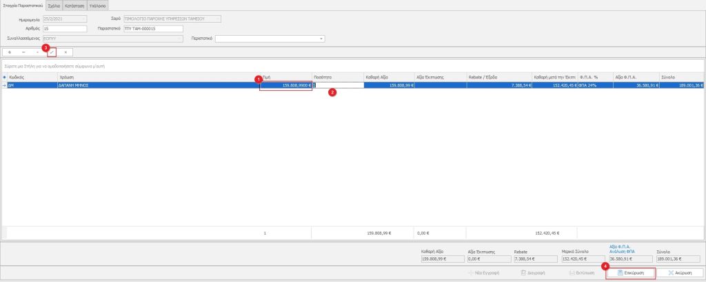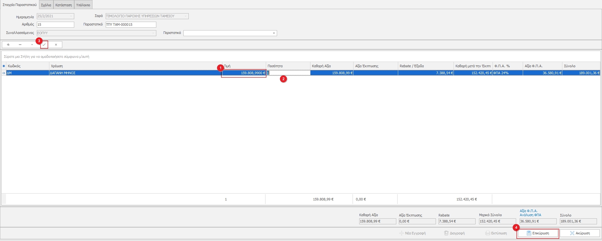 Αφού επιλέξουμε τη χρέωση ξεκινάμε την αντιγραφή των ποσών ξεκινώντας από το πεδίο Τιμή(1) όπου συμπληρώνουμε την Καθαρή Αξία και συνεχίζουμε στα υπόλοιπα πεδία(2). Μόλις συμπληρώσουμε τα ποσά κάνουμε κλικ στο κουμπί  (3) και επικυρώνουμε(4).