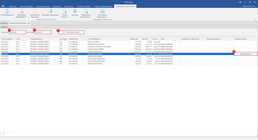 Κάνουμε κλικ στο κουμπί Ανάκτηση/Ανανέωση(3) για να εμφανιστούν τα παραστατικά με βάσει το διάστημα που επιλέξαμε.