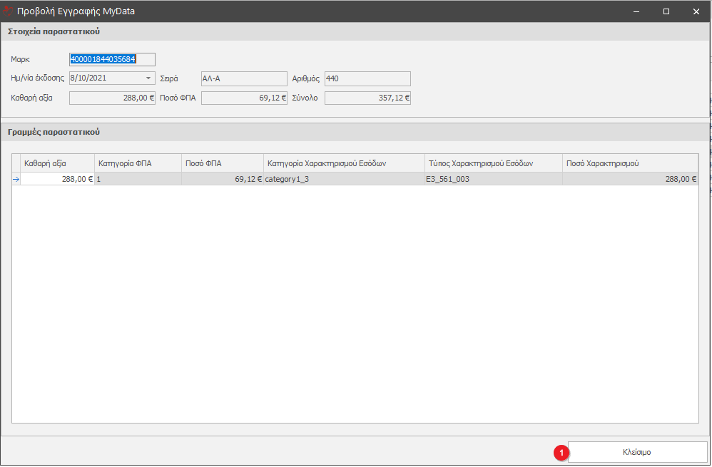 Στο αναδυόμενο παράθυρο παρουσιάζονται όλες οι πληροφορίες MyData του παραστατικού. Για κλείσιμο του παραθύρου πατήστε το κουμπί Κλείσιμο(1).