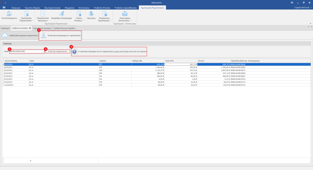 Ανάκτηση καταχωρημένων παραστατικών(1). Στο πεδίο Μαρκ(2) συμπληρώνουμε τον αριθμό Μαρκ παραστατικού και κάνουμε κλικ στο κουμπί Ανάκτηση παραστατικών(3). Τα αποτελέσματα της ανάκτησης αφορούν παραστατικά με Μαρκ μεγαλύτερο από αυτό του φίλτρου, όπως περιγράφεται στην προειδοποίηση(4) της υποκαρτέλας.