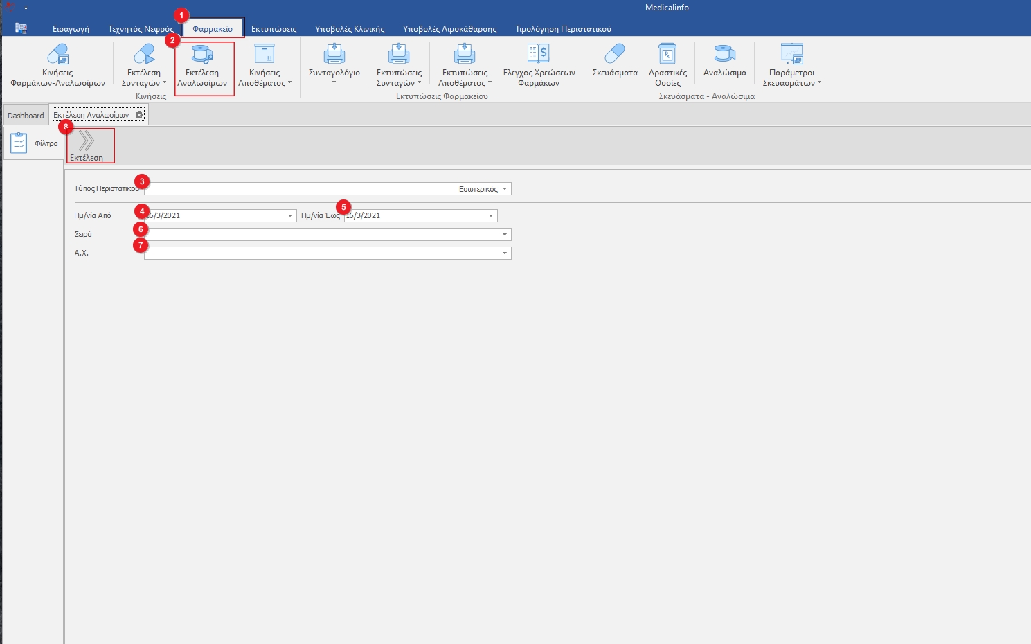 Στην καρτέλα Εκτέλεση Αναλωσίμων επιλέγουμε τον Τύπο του Περιστατικού(3), την Ημερομηνία Από(4) και Έως(5) διάστημα στο οποίο θα πραγματοποιηθεί η εκτέλεση, την Σειρά(6) παραστατικού που θα δημιουργηθεί, τον Αποθηκευτικό Χώρο(7) από τον οποίο θα αφαιρεθούν τα αναλώσιμα και τέλος κάνουμε κλικ στο κουμπί Εκτέλεση(8).