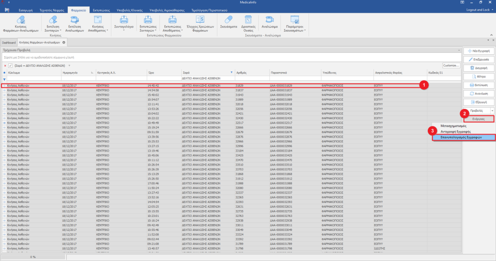 Στην συνέχεια επιλέγουμε το πρώτο και κάνουμε (CTRL+A) ώστε να τα επιλέξουμε όλα προχωράμε δεξιά στο μενού επιλέγουμε Ενέργειες(2) και Επανυπολογισμός Εγγραφών(3).