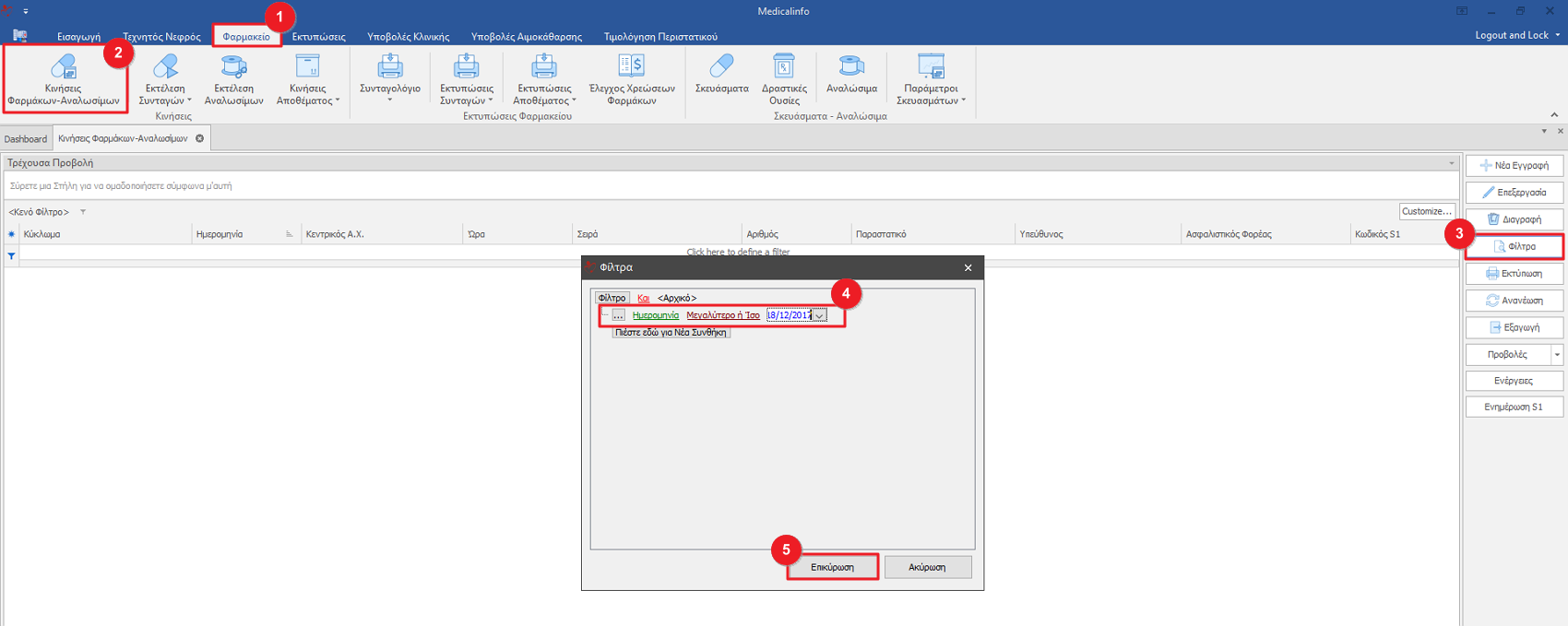 Μεταβαίνουμε στο Φαρμακείο(1) επιλέγουμε Κινήσεις Φαρμάκων-Αναλωσίμων(2)  και ορίσουμε τα Φίλτρα(3).